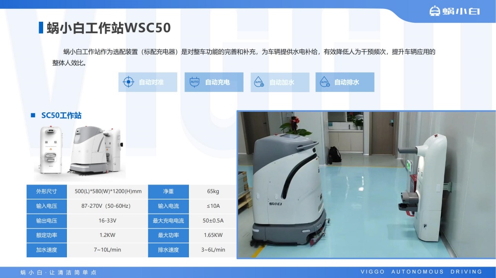 蜗小白SC50无人驾驶洗地机是智行者科技推出的一台洗扫推一体,一机多用的通用型智能清洁洗地车,具备精准环境感知、自动路径规划、自主避障、自动充电、自动加/排水、污水自动过滤等功能,可轻松应对水泥、大理石、PVC等各种室内中小型场景硬地面。